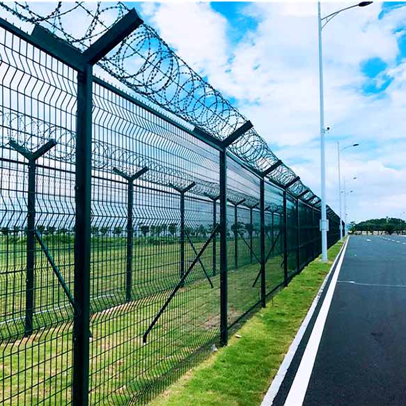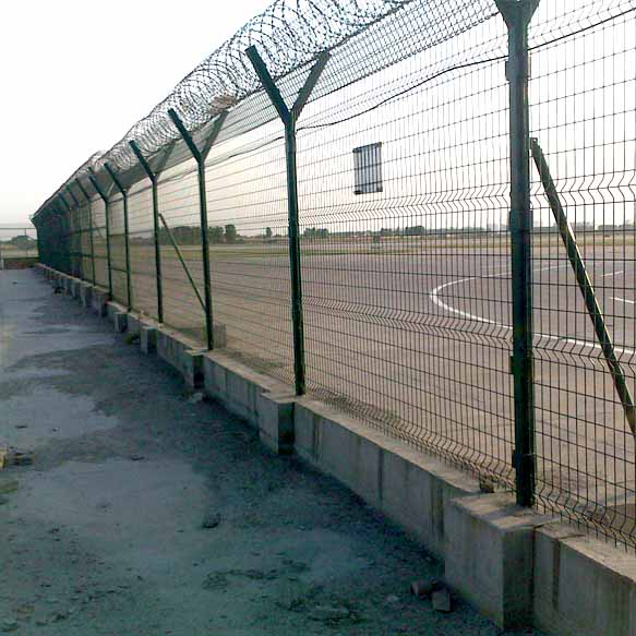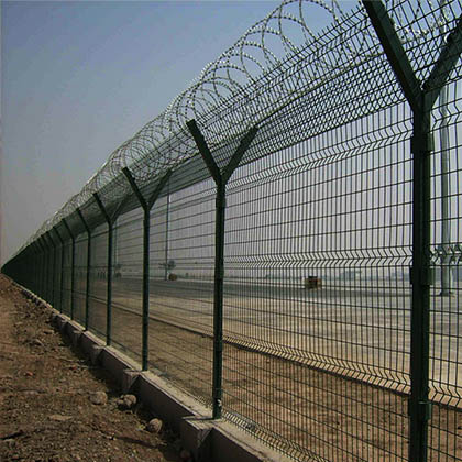 機(jī)場(chǎng)圍網(wǎng) 機(jī)場(chǎng)圍界 機(jī)場(chǎng)護(hù)欄網(wǎng)又叫鋼筋網(wǎng)圍界,主要用V型支架立拄,加強(qiáng)型焊接片網(wǎng),安全防盜連接件和熱鍍鋅刀片刺籠組成強(qiáng)度和安全