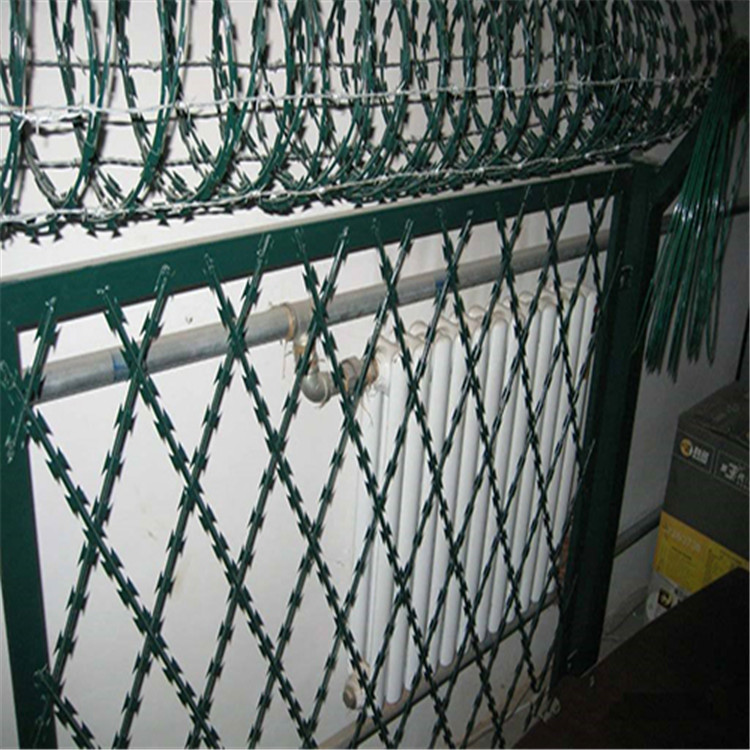 刺繩護(hù)欄網(wǎng)是在兩條刀片刺網(wǎng)之間以不銹鋼片和鍍鋅鋼片強(qiáng)力夾扣,展開(kāi)后即呈交叉狀,本產(chǎn)品具有防腐、防老化、抗曬、耐候等特點(diǎn)。使用在監(jiān)獄防護(hù)上更起到防攀爬的作用。