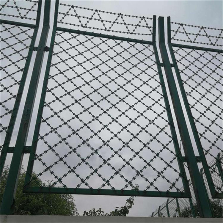 名刀片刺繩阻隔網(wǎng)、刀刺防護(hù)網(wǎng)。監(jiān)獄刀片阻隔網(wǎng)是一種新型防護(hù)網(wǎng)。該產(chǎn)品具有嚇阻作用好。漂亮。施工便當(dāng)。經(jīng)濟(jì)實(shí)用等優(yōu)異特色,刀片阻隔網(wǎng)主要用于園林公寓。機(jī)關(guān)單位。監(jiān)獄。哨所。邊防等的圈禁防護(hù)。