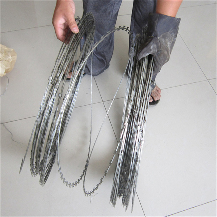 刀片刺網(wǎng)用途:用于草場邊界、鐵路、高速公路的隔離防護以及園林公寓,監(jiān)獄,哨所,邊防等的圈禁防護。刀片刺網(wǎng)一般用于監(jiān)獄做防護用,因刀片鋒利不易觸摸,起到一定的嚇阻作用,刀片刺繩用途比較廣泛,他可以用于居民的墻體防護,也可以用來圈地等,該刺繩防盜效果比普通刺繩要好,價格也不高,所以刀片刺繩越來越應用廣泛。