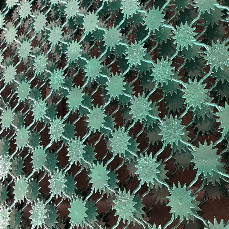 梅花刺防沖監(jiān)獄隔離網(wǎng)為單層梅花刺片網(wǎng),直徑不小于7.5cm,刺片厚1.5mm,采用Q235低碳鋼板沖壓成型。網(wǎng)片為菱形網(wǎng)孔,網(wǎng)格尺寸:120mm*110mm(高*寬),網(wǎng)絲直徑8mm,采用S195線材高壓焊接,每一個(gè)焊點(diǎn)附焊梅花刺一個(gè)。