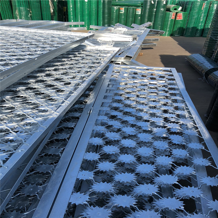 監(jiān)獄梅花刺片隔離網(wǎng)、立柱要求整體熱鍍鋅,上鋅量不低于300克,可做霧化試驗(yàn)(附檢測報(bào)告),隔離網(wǎng)整體鍍鋅在內(nèi)陸自然環(huán)境下,鋅層要求使用不低于10年。電動(dòng)鋼閘門外框采用60mm*60mm*3mm(厚)方鋼,內(nèi)框與網(wǎng)片邊框相同,門扇規(guī)格為5米*3米*2(高*寬),每單扇門中間加50*50*2mm橫襯方管,對(duì)開、平移。