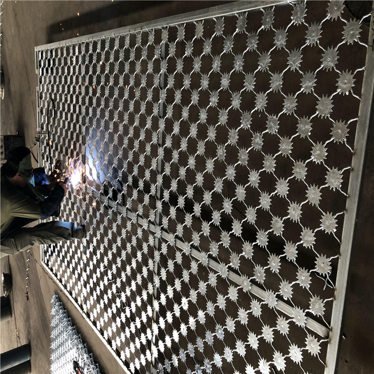 監(jiān)獄帶剌的隔離網網片、立柱要求整體熱鍍鋅,上鋅量不低于100克,可做霧化試驗(附檢測報告) ,護欄網整體鍍鋅在內陸自然環(huán)境下,鋅層要求使用不低于10年。監(jiān)獄太陽花隔離網看守所梅花刺美格網護欄