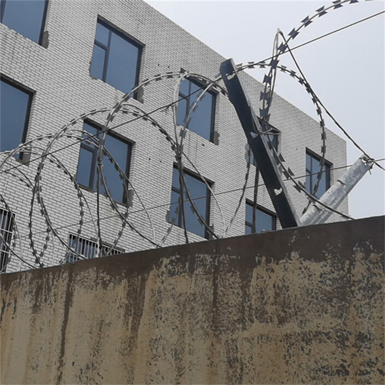 是一種近年發(fā)展起來(lái)的防護(hù)、隔離能力較強(qiáng)的新型防護(hù)網(wǎng)產(chǎn)品。它采用鋼板沖壓成型包附于鋼絲(筋絲)之上,由銳利尖角鍍鋅鋼板或不銹鋼薄板做刀片,高張力鋼絲做芯線組合而成的。鋒利的刀型刺由雙線扣裝后成蛇腹?fàn)睿让烙^又讓人不寒而粟。起到了很好的阻嚇作用。該產(chǎn)品具有美觀、防阻效果好、施工便利等優(yōu)點(diǎn)。