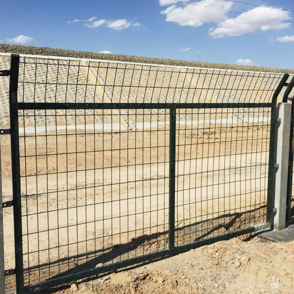 鋼筋混凝土立柱金屬網(wǎng)片防護(hù)柵欄可采用單開門或雙開門兩種形式。單開寬度1.5m,雙開寬度3m,其網(wǎng)片形式與防護(hù)柵欄保持一致,并通過銷鈾、銷鈾套與立柱連接。