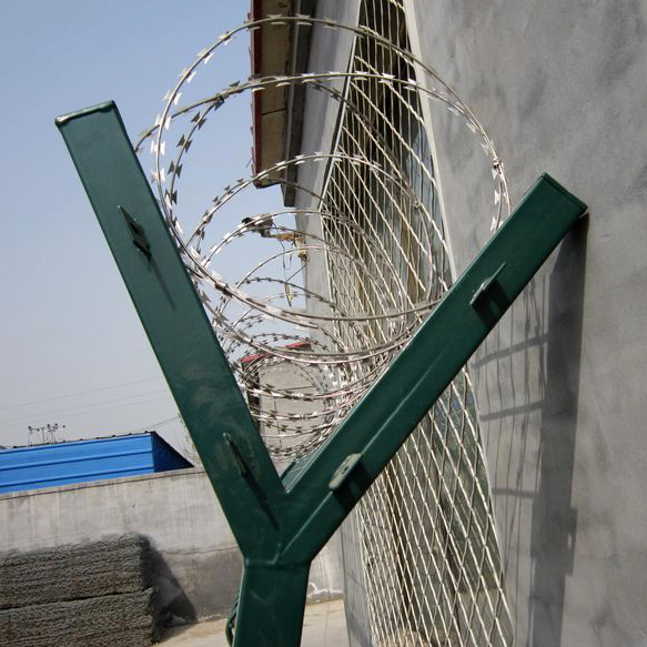 4、在防攀爬刀刺網(wǎng)的Y字型支架的兩邊各拉一根鋼絲,對刺網(wǎng)進(jìn)行再固定,以免左搖右晃。