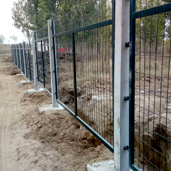 高鐵防護(hù)柵欄為冷拔鋼絲點(diǎn)焊熱鍍鋅再熱浸塑網(wǎng)片,外型尺寸為2760*1790mm,網(wǎng)格尺寸為75*150mm,鋼絲為φ4mm , 網(wǎng)片邊框采用30*50mm的方管焊接而成,防盜螺栓的螺柱、螺帽、墊圈等作熱鍍鋅處理。鐵路柵欄網(wǎng)片表面采用熱浸塑處理,顏色為墨綠色,整個(gè)結(jié)構(gòu)表面平整光滑,色澤均勻,無(wú)漏鍍、開(kāi)裂、脫皮及脫落等缺陷。網(wǎng)片浸塑所用的材料及PE表層環(huán)保性好,無(wú)污染。網(wǎng)片上方加裝蛇腹形滾刀網(wǎng),有效的防止攀爬。